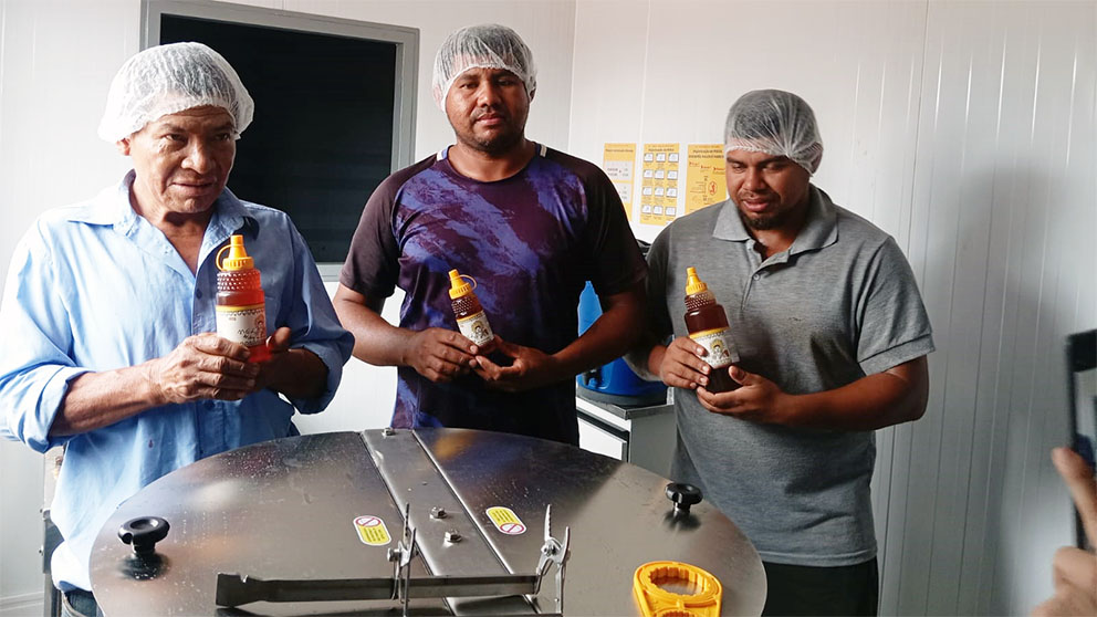 Carlos também destacou o impacto direto dos novos equipamentos para a agroindústria de mel na aldeia. “Antes de a gente receber os equipamentos, era tudo manual. A produção era pouca e desperdiçava muito mel. Agora, com essas máquinas mecanizadas, vai melhorar muito. Antes, nossa produção anual era em torno de 300, 350 quilos de mel. Com tudo mecanizado, vai mais que dobrar essa produção, com menos desperdício. Está facilitando muito, porque agora temos um lugar adequado para fazer a extração”.