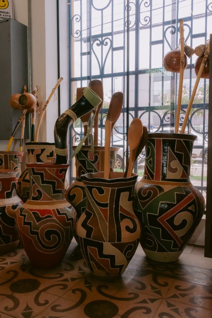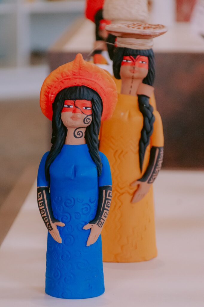 Eliane dá algumas dicas de peças para presentear neste Natal. “Nós temos aqui umas onças feitas pelo nosso artesão Cleber de Brito, uma onça com filhote, está na faixa de 180 reais, mas temos outras menores que na faixa de 80 reais, e as tamanhos P. Temos outras sugestões também, temos essas índias de cerâmica feita pela nossa artesã Leslie Bassi Gaffuri, está na faixa de 70 reais as menores, e as maiores a 90 reais. E também temos peças em cabaça da nossa artesã Lorna Nantes, está na faixa de 45 reais as menores e as maiores e está na faixa de 100, 130 reais. Claro que temos outras opções mais em conta, que são chaveiros, feitos de sementes da região, que estão na faixa de 8 reais, 10 reais, ímã de geladeiras e brincos, né, tudo nessa faixa de 15 reais, os brincos da Maria Joana, da Antônia dos Reis, e é tudo feito com material da terra, sementes, cabaças. As xícaras são de cerâmicas feitas, pintura tudo à mão, tá? Tem a nossa artesã aqui, que é a Nilza, ela é muito caprichosa. Os copinhos dela estão na faixa de R$ 30,00. Agora tem um jogo de xícara que está na faixa de R$ 60,00, R$ 80,00 também. Temos peças em madeira da nossa artesã Ana Vitorino. São peças para uso mesmo. Essas peças, porta-aperitivo, gamela, feita de madeira. Estas peças aqui estão na faixa de R$ 65,00. Tem colheres que estão na faixa de R$ 12,00, R$ 15,00 também. Então tem uma infinidade de presentes, de sugestões que a pessoa tem que vir aqui para conhecer. Tem as bolsas de fibra, lá de Corumbá, da artesã Catarina Guató, muito querida, essas bolsas aqui estão na faixa de R$170,00. A peça mais cara é um quadro que está na faixa de R$ 1.200. É uma das peças mais caras que eu tenho. O nome do artesão é Marcos Ortiz. Ele é de Bonito. Uma mandala. Os vasos grandes Kadwéu estão na faixa de R$ 600, os maiores e os menores na faixa de R$ 200, R$ 130. Nós temos o artesanato em osso, feito em Jardim, pela nossa artesã Assunção Alves, uma petisqueira, que está na faixa de 105 reais, e tem porta guardanapo, tem pentes, tudo em osso, feito em osso. Então, é muito lindo o trabalho dela, vale a pena prestigiar”.