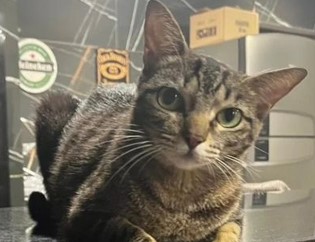 A gatinha é de porte pequeno a médio, tem pelagem curta com padrão tigrado preto e listras bem marcadas em todo o corpo. O rosto apresenta máscara rajada, com destaque para os olhos grandes, arredondados e verde-amarelados, que dão expressão bastante atenta.