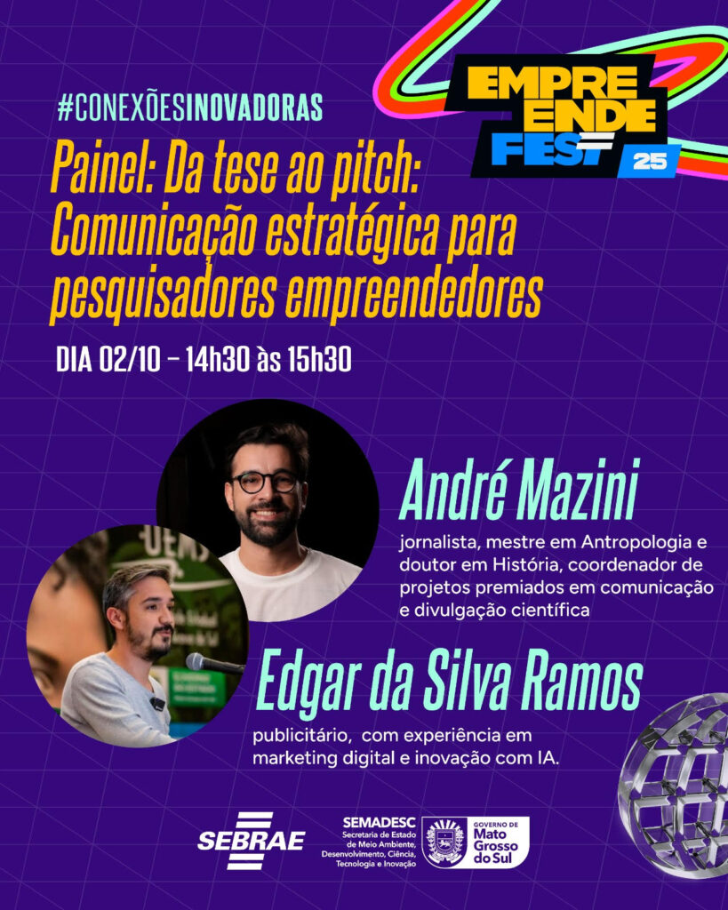 Durante o EmpreendeFest 2025, que será realizado nesta semana, pesquisadores e pesquisadoras poderão assistir gratuitamente ao painel intitulado “Da tese ao pitch: comunicação estratégica para pesquisadores empreendedores”, que tem o objetivo de fortalecer a divulgação científica no estado e aproximar pesquisadores da sociedade por meio de ações estratégicas de comunicação.