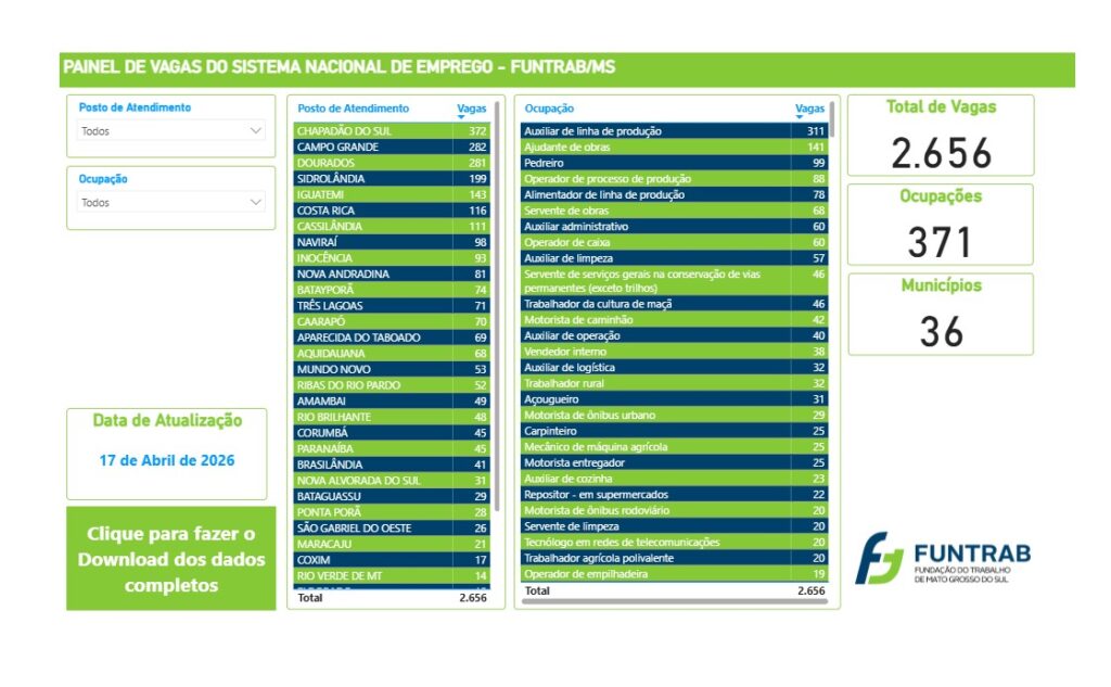 Mato Grosso do Sul inicia esta semana com 2.656 vagas de emprego abertas em 36 municípios, conforme painel atualizado da Funtrab em 17 de abril de 2026. Ao todo, são 371 ocupações diferentes disponíveis para trabalhadores que buscam recolocação profissional no Estado.