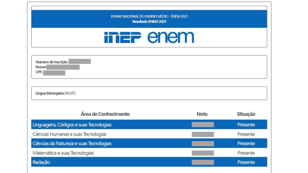 As notas podem ser acessadas na Página do Participante, onde estão disponíveis a pontuação da redação, que varia de zero a mil pontos, e o desempenho nas quatro áreas de conhecimento avaliadas. Para os chamados treineiros, estudantes que ainda não concluíram o ensino médio em 2025, o boletim individual será disponibilizado em até 60 dias após a divulgação dos resultados, segundo o Inep.