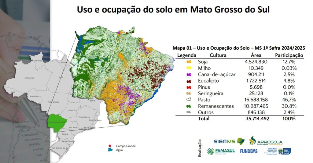 Os dados apontam que essa é a maior área ocupada entre todas as atividades agropecuárias sul-mato-grossenses e corresponde a 46,7% da extensão territorial do estado, que é de 35,7 milhões de hectares. Na sequência, considerando que os dados são referentes à primeira safra do ciclo, embora sejam os mais recentes divulgados, aparecem a soja, com 4,5 milhões de hectares (12,7% do território estadual), e o eucalipto, com 1,7 milhão de hectares (4,8%).