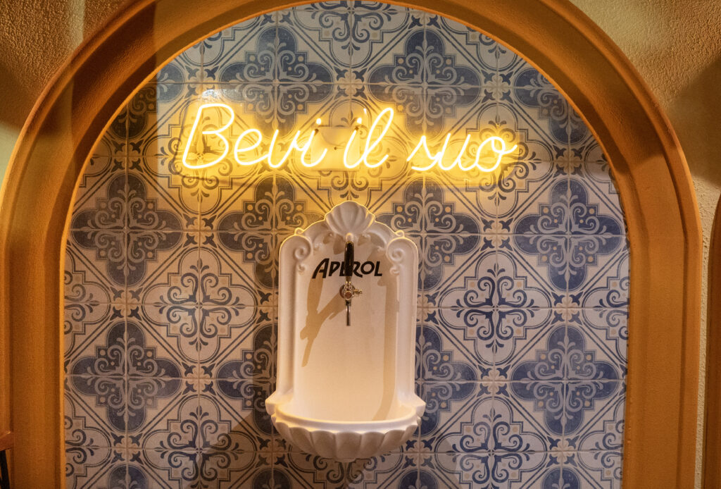 Não por acaso, o bar conquistou uma chancela inédita no Estado: é a primeira Casa Aperol de Mato Grosso do Sul, resultado de uma parceria direta com a marca. Um dos grandes diferenciais da casa é a fonte exclusiva de Aperol Spritz, servida diretamente da torneira. A peça se inspira nas fontes de água da Itália do período do Império Romano, transformando o ato de servir o drink em parte essencial da experiência.7