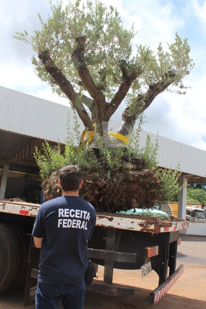 Oliveiras centenárias apreendidas pela Receita Federal serão entregues à UEMS para uso em projetos científicos, ambientais e educativos. (Foto: Receita Federal/Divulgação).