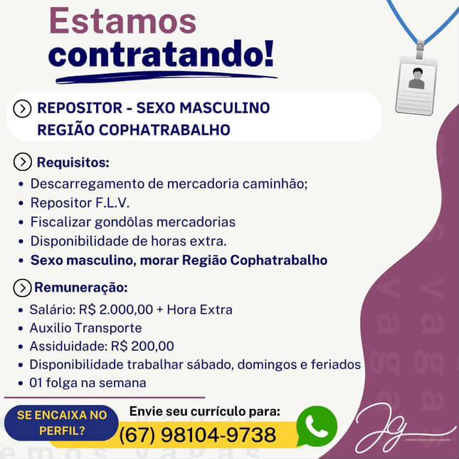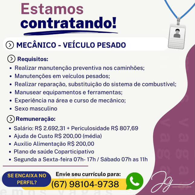 Confira os requisitos, benefícios, horários de trabalho e, se for de acordo com o seu perfil, entre em contato.