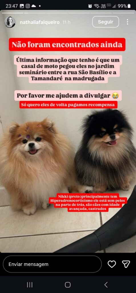 Horas depois, ainda em seu perfil no Instagram, a dona fala de um possível crime e afirma: “Só quero eles de volta, pagamos recompensa”.