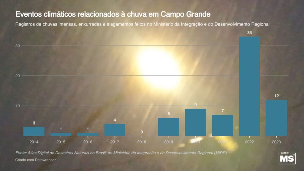 Campo Grande enfrenta desde 2019 a intensificação de eventos climáticos extremos que têm provocado chuvas intensas, enxurradas e alagamentos em diferentes regiões da cidade. Segundo o Atlas Digital de Desastres Naturais no Brasil, do Ministério da Integração e do Desenvolvimento Regional (MIDR), levantamento de dez anos feito pelo Made in MS mostra que, entre 2014 e 2023, até a primeira metade do período, ou seja, até 2018, o número de ocorrências registradas no órgão federal era relativamente estável e baixo, com média anual de 1,8 evento e pico de, no máximo, quatro registros, alcançado em 2017. A partir de 2019, no entanto, houve uma mudança expressiva: o total de registros subiu de seis naquele ano para nove em 2020, sete em 2021 e atingiu o ápice em 2022, com 33 ocorrências, um aumento de mais de 725% em relação ao maior valor da série anterior. Veja mais detalhes nos infográfico logo abaixo!