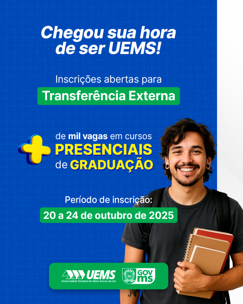 A Universidade Estadual de Mato Grosso do Sul (UEMS), por meio da Diretoria de Registro Acadêmico (DRA), publicou o Edital nº 62/2025/DRA/UEMS, que regulamenta o processo de Transferência Externa para 50 cursos presenciais de graduação da instituição, com ingresso previsto para o ano letivo de 2026. Ao todo, são 1.130 vagas disponíveis, somando ampla concorrência, com 1.021 vagas e cota RMS (Residente em Mato Grosso do Sul), com 109 vagas.