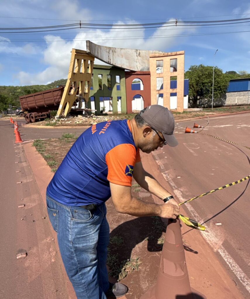 Uma carreta colidiu com o monumento do portal de entrada de Corumbá, na fronteira com a Bolívia, de acordo com o Corpo de Bombeiros, neste domingo (19). Equipe da Defesa Civil esteve no local para avaliar os danos e constatou a necessidade de demolição controlada de parte da estrutura, que será posteriormente reavaliada no contexto estrutural geral do monumento.
